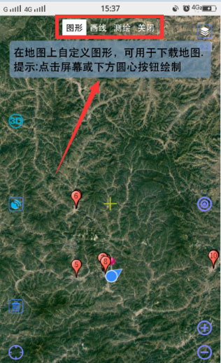 不区分图形框选、画线测距和测绘,工作完成后按住屏幕可以保存工作;