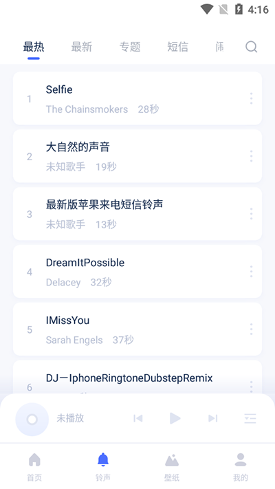 1、在本站下载爱思极速版安装到手机上,点击“铃声”可以根据铃声的类别选择下载,也可以点击上面的搜索栏快速搜索铃声。