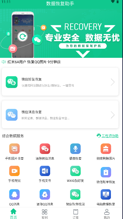 1、微信恢复:微信聊天记录恢复、微信好友恢复、微信照片恢复、文件恢复等。
