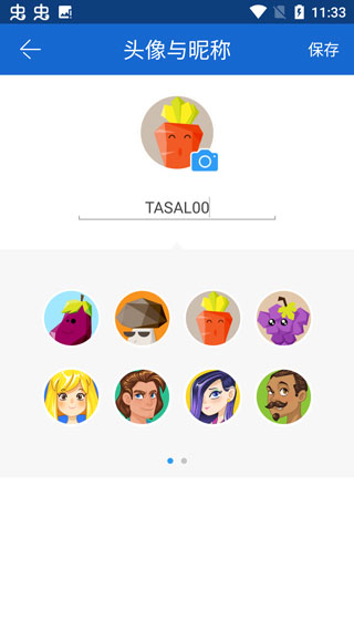 2、可以在上面填写自己的昵称,和选择下方的图标作为自己的大头贴,然后点击右上角的保存按钮。