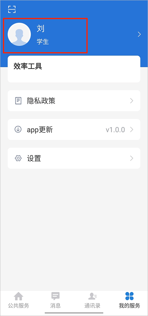 2、点击选择要进入APP的身份,以学生为例,在我的服务的顶部蓝色区域,可以看到所选的身份