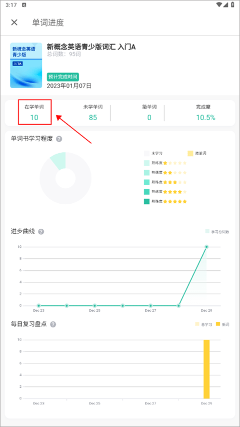 3、来到单词进度界面,点击“在学单词”,就能看到之前的学习记录啦。