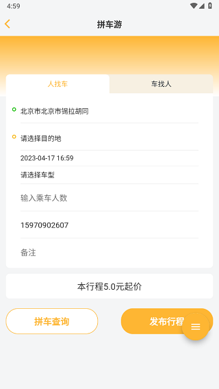 2、发布自己需要的拼车订单,APP会自动的进行匹配。