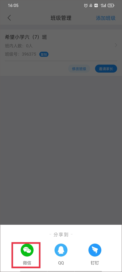 4、页面下方弹出了三个分享方式:微信、QQ、钉钉,选择其中一个之后将链接发出去,家长点进这个链接之后就可以进入到班级里查看自身孩子的学习情况了。