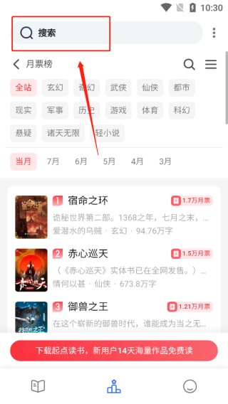 3、可根据上方分类进行搜索小说,小说排名按月票进行排名