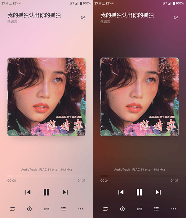 椒盐音乐提供了浅色和深色两套正在播放界面可供选择,你可以在「设置 > 用户界面」下的「播放界面」选项中进行切换,或让它随系统自动改变。根据我自己的实测来看,两个播放界面都非常的好看,甚至还一度让我陷入了选择困难症。