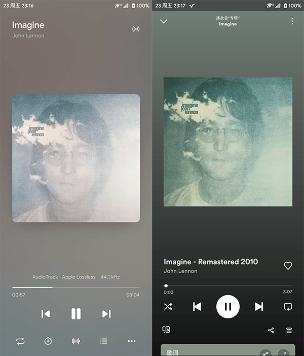 3、再来看看听歌界面,歌曲界面由两部分组成,一面是专辑封面一面是歌词,这两面让你在听歌时不会觉得很单调。在专辑那一面会显示歌曲的格式类型和码率,对于音乐发烧友来说这项功能还是很特殊的。歌曲播放时的界面为,高斯模糊的流光,可以在设置里设置流光的效果,例如主题和流光效果的强弱。
