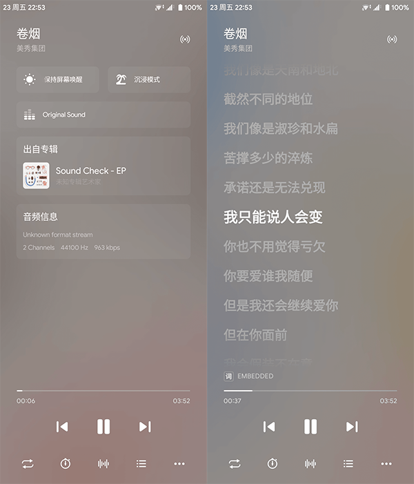 椒盐音乐还提供了一个「动态流光」的选项,我强烈建议你开启。打开后,你就可以在 Android 设备上获得接近 iOS 中 Apple Music 好看的动态模糊背景效果。不过要注意的是,动态流光在深色模式下才有比较好的观感,浅色模式下的效果实在是不明显,不仔细看的话很可能会看不出来。