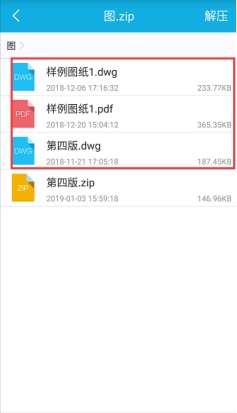 4、如果不是dwg、dxf格式的文件,先点击右上角的解压,选择保存的路径,点击确定进行解压,然后找到图纸并打开