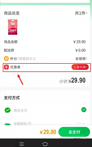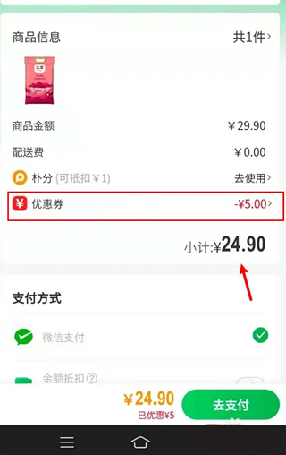 5、完成后,返回页面,就可以看到已经通过优惠券,减免费用了。