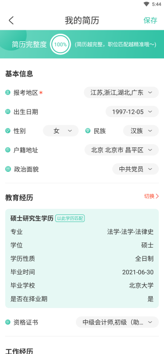 2、将简历填写完整,选择保存,系统将会根据你的简历匹配合适的职位。