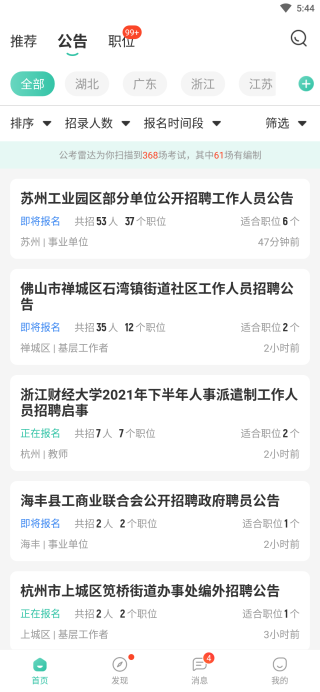 在新公告中,你能看到你所关注地区当前发布的新考试公告。公告信息同步官方网站,可通过新公告查看公告详情、职位列表,及此公告相关报考小提示: