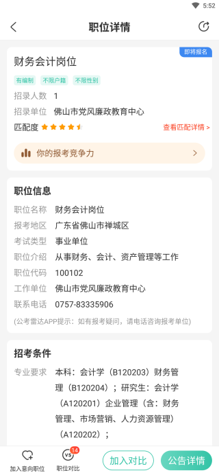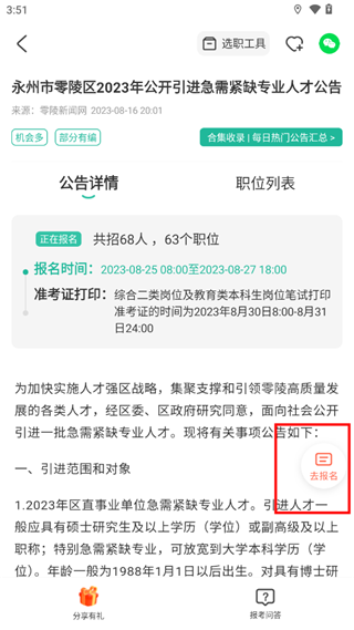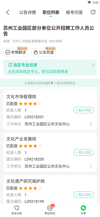 2、点击适合的考试进入查看[公告详情][职位列表],选择职位详情查看