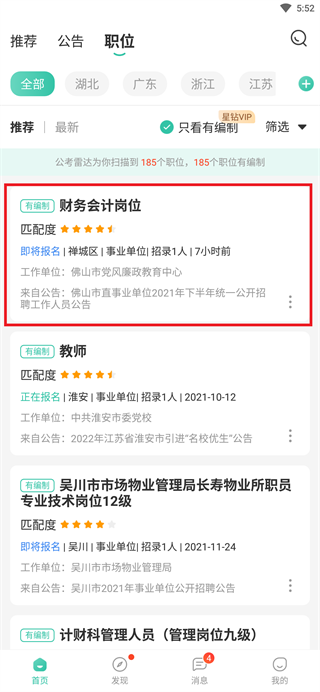 1、点击[首页][适合我的职位],进入职位列表可查看新发布公告中适合你的职位(星星越多匹配度越高)