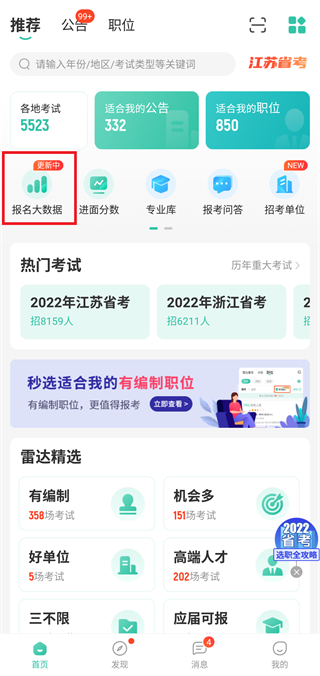 1、进入公考雷达APP[首页],点击首页中的[报名大数据] (如下图所示)可查看考试的职位缴费人数、热门招考单位、竞争最激烈