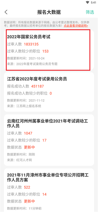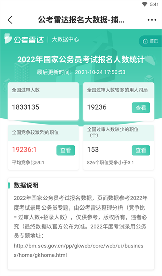 2、公考雷达的报名考试数据来源招录单位的官网数据,由公考雷达整理发布,仅供参考。招考单位未发布报名数据的考试将不会显示报