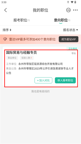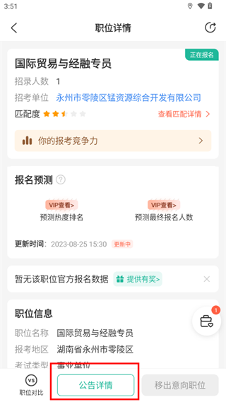 的职位、无人缴费职位等数据。点击具体职位或底部的公告、职位页面可查看职位的具体报名人数。