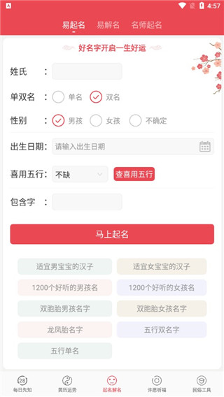周易算命app是一款专为用户提供算命测字服务的软件应用。现在已经升级为365小时光,使用起来非常方便。用户可以随时进行算命,并且还提供了其他功能,比如起名、算卦等等,非常专业。该软件软件能够帮助用户了解自己的命运,并提供多种预测类型选择,全方位预测自己的人生。该软件拥有着众多实用功能如周易算命、每日运势、周公解梦、爱情配对、求签断事、姓名五行、面相大师、起名大师等一系列实用功能,能够轻松满足不同用户的算命需求。感兴趣的朋友不妨下载尝试一番吧!