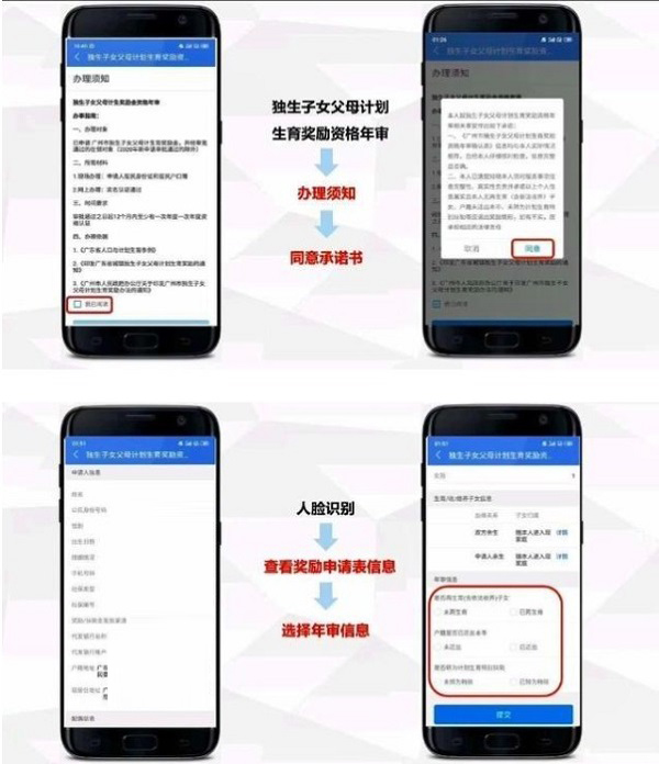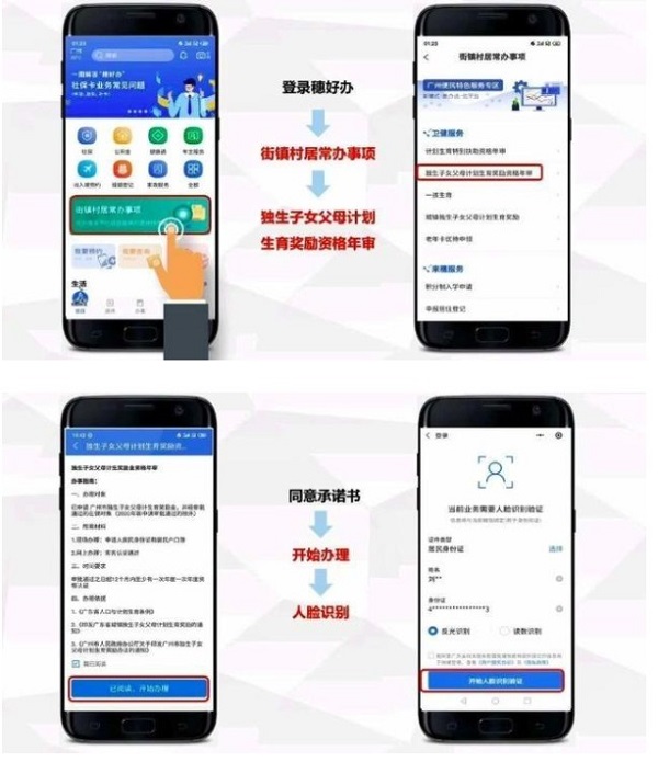下载“穗好办”APP,注册账号并登陆,选择“首页”—“街镇村居常办事项”—“卫健服务”—“独生子女父母计划生育奖励资格年审/计划生育特别扶助资格年审”,填写信息,核对个人婚育情况,进行人脸识别,并根据自身实际情况提交承诺事项。