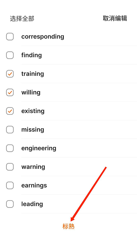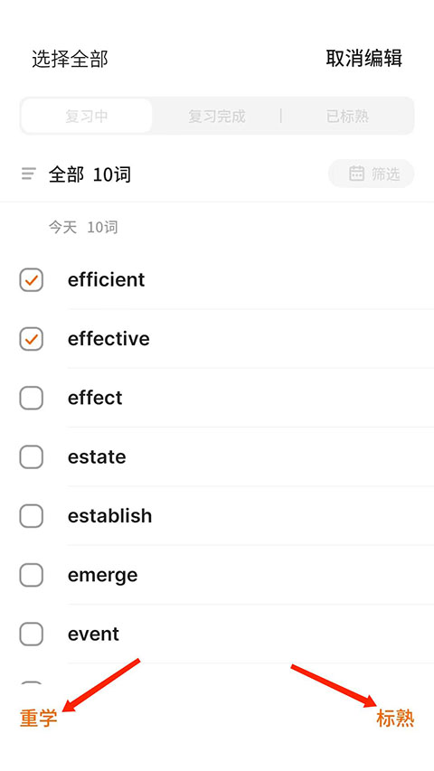 4、将下方单词进行勾选,选择“重学”或者“标熟”,