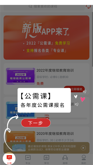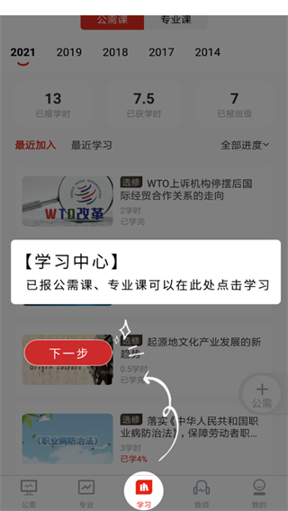 3、已报公需课、专业课可以在“学习”页面点击进行学习
