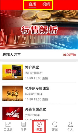 3、课堂页内又分为直播和视频两个页签,点击视频页,即可收看精选视频回放