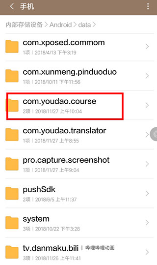3、随后在手机本地的Androiddatacom.youdao.courseCourses文件夹下方,就能够找到刚刚缓存的视频文件进行导出了,找不到的话可以设置显示隐藏文件。
