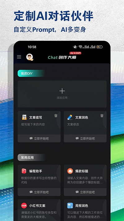 3、应用界面,用户可以使用编程助手、爆款标题、周报润色等应用,也能自己添加其他应用使用