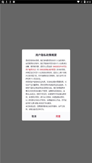 2、点击同意央视频软件许可及用户服务协议和央视频隐私保护政策。