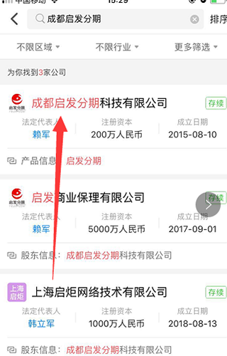 1、下载安装之后打开APP;输入需要查询的公司的名字关键字;