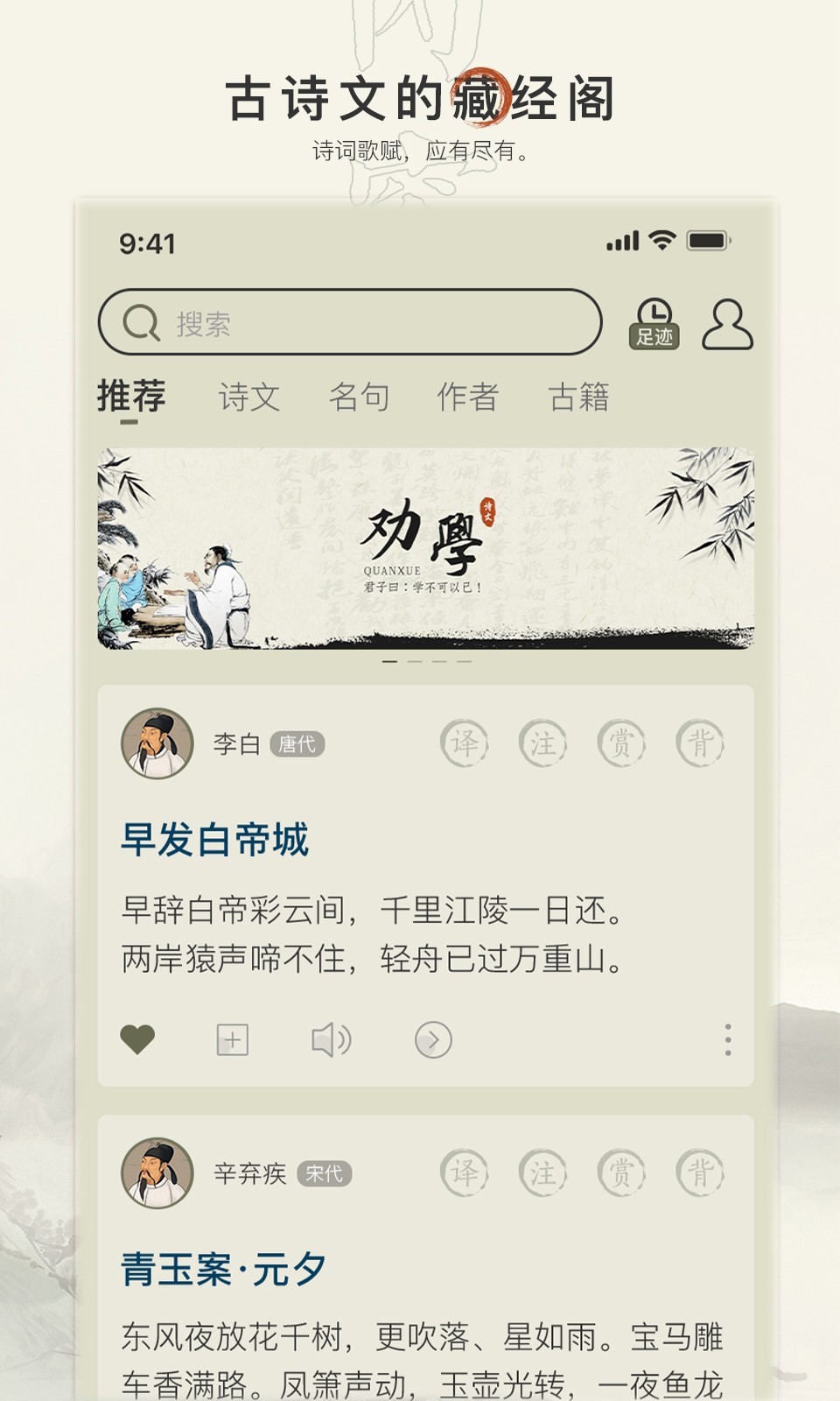 古诗文网APP即古诗文网手机版是一款老牌纯净的古诗文app,支持翻译、注释、赏析、背诗等等功能,古诗文网作为传承经典的网站专注于古诗文服务,致力于让古诗文爱好者更便捷地发表及获取古诗文相关资料,喜欢古诗,以及对古诗学习有需求的朋友可以下载使用!