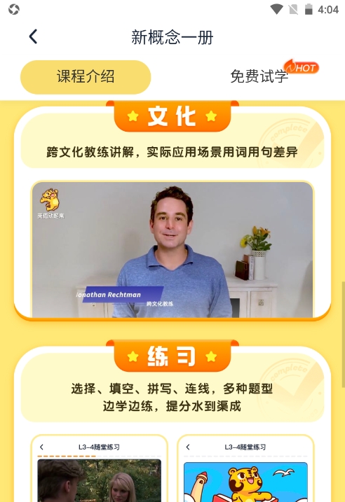 每节课包含听力、发音、单词、语法、文化、练习等多个模块,全方位训练。