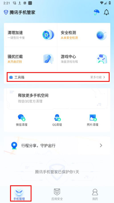 1、打开软件,在手机管理页面选择工具箱,点击更多功能