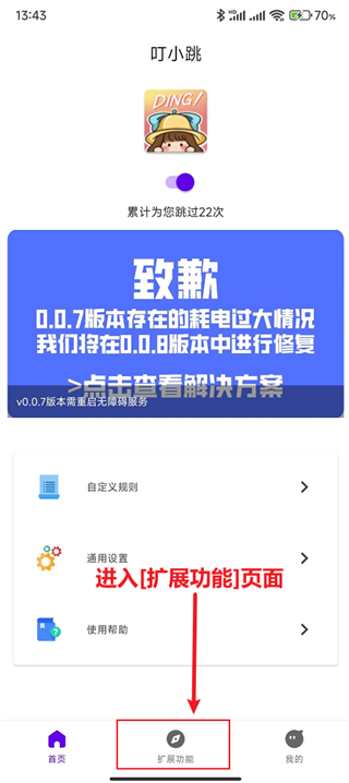 1、在「叮小跳」功能页面中点击「扩展功能」页面。