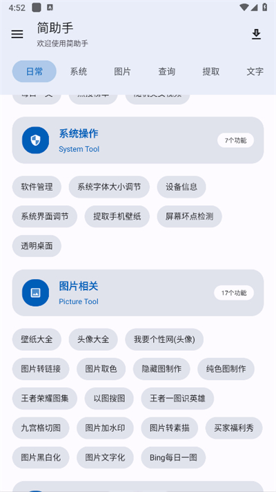 简助手2024最新版是一款集合了众多实用功能的手机应用。该软件中各种功能一应俱全如时间管理、文件管理、文件搜索等手机应用,刻度尺、指南针、字典查询、图片处理等,日常应用。还为用户提供了系统清理和优化功能,让用户轻松将手机中的各种垃圾文件、无用数据和缓存文件,轻松处理,让自己手机存储空间大大提升,彻底优化用户手机。众多功能为用户带来了生活的全新便捷,轻松满足用户在日常中的生活需求。