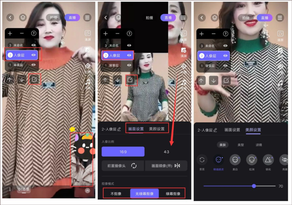 1080P超高清抠像技术,支持精细调节抠像强度,有无绿幕都可完成抠像;还可自定义添加绿幕保护区,让您的绿色产品也能轻松展示;通过人像裁剪,即使没有绿幕的边角处也无需担心露出实景!