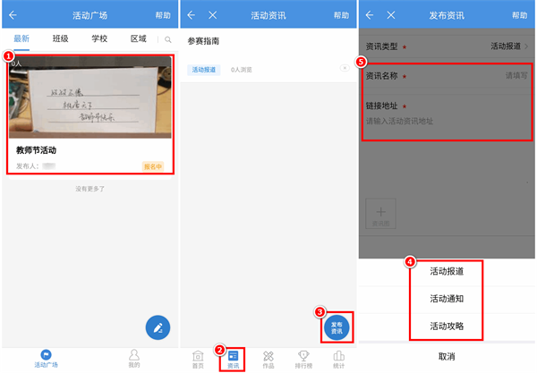 教师登录APP在“工作”-“活动广场”中找到此次活动,点击底栏“资讯”-“发布资讯”;选择资讯类型,填写“名称”、“链接地址”、“封面”即可发布。