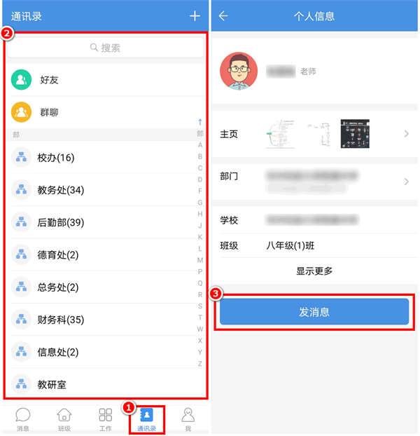 教师用户:登录APP,点击下方“通讯录”,可选择通讯列表中的成员进行私聊。