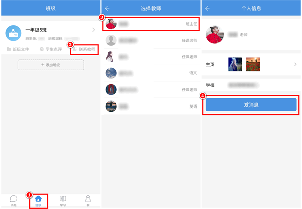 家长和学生:登录APP,点击“班级”-“XXX班”-“联系教师”,可选择与班中老师进行私聊,暂不支持学生之间的私聊。