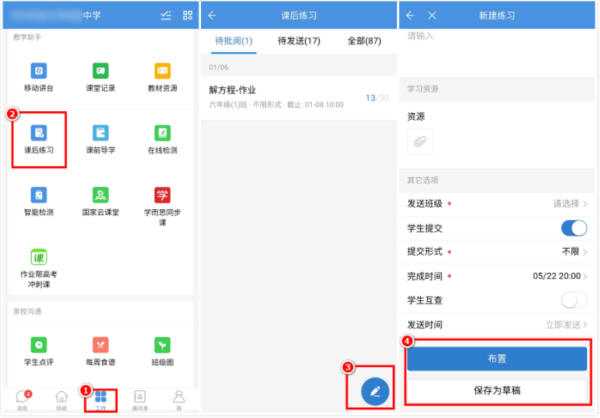 教师登录移动端APP,点击“工作”—“课后练习”,点击右下角笔状图标,填写相关信息,其中点击“资源”有多种选择,点击“发送班级”可推送不同的学习小组实现差异化教学,选填完全部信息即可点击“布置”一键推送给学生或者“保存为草稿”,以后再进行推送。
