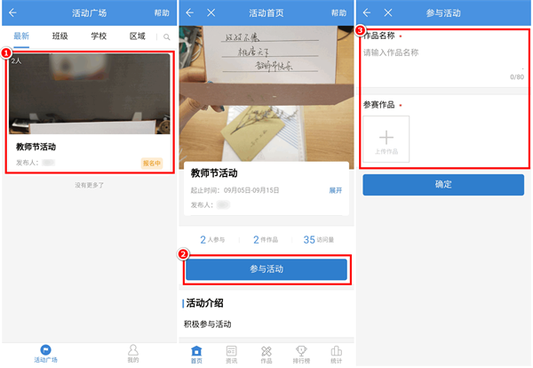 学生登录移动端APP,点击“学习”-“活动广场”,在活动广场页面点击相应的活动,可查看活动详情“介绍”、“资讯”、“作品”、“排行榜”、“统计”,点击“我要参赛” 即可上传作品,参与活动。