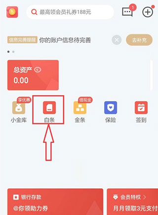 1、在本站下载并安装京东金融App,完成后打开,进入首页,打开【白条】选项,如下图所示
