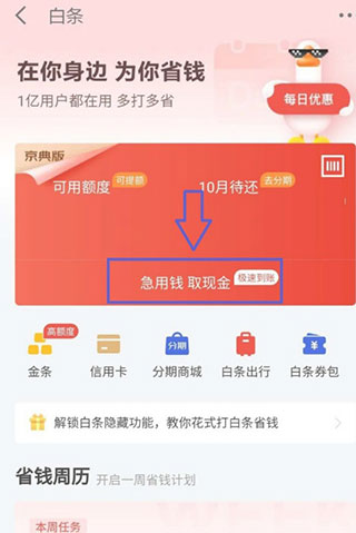 2、进入白条页面,点击【取现金】选项,如下图所示。