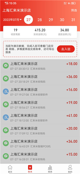 2、首页账本实时更新,随时查看门店收入,了解经营状况及生意动态