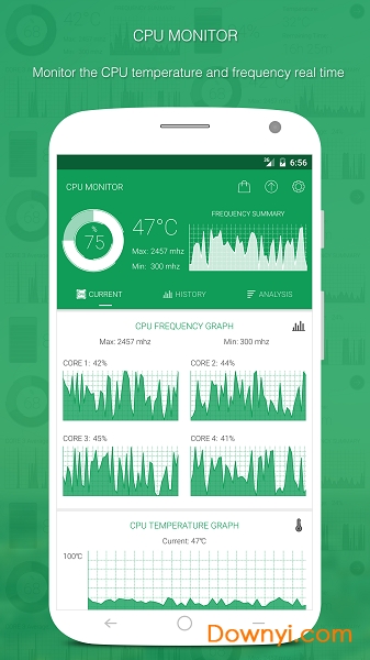 3.cpumonitor最强大的功能是可以对cpu负载的历史数据进行详细分析,你可以看到过去一段时间内系统资源的使用情况,同时你还可以清楚的看到手机了各个应用的资料