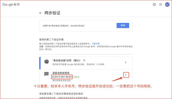 特别提示:谷歌两步验证器开启后如果刚才用于验证的手机号非本人又或者是JM平台的号码,一定要将其移除掉。