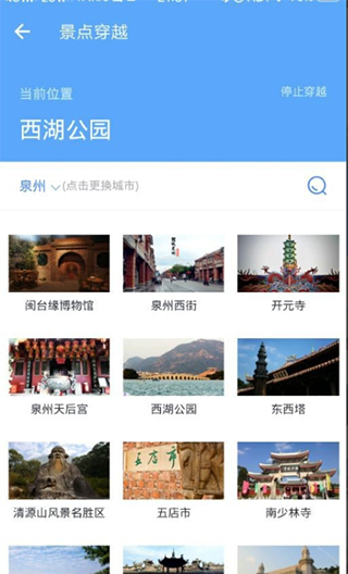 3、点击进入景区穿越页面,可以看到我们目前的位置信息,默认情况下是我们所在的城市。