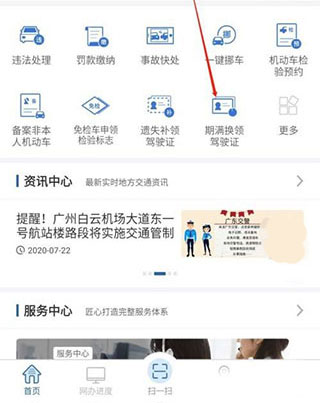 最后回到交管12123首页,找到期满换领驾驶证功能,点击进入办理换证即可