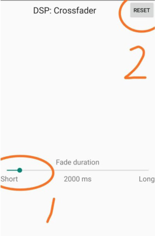 5、foobar2000可以细微调整的DSP共5个,现在看第一个,Crossfader(交叉渐变器),可以实现音乐淡入淡出效果,拖动图1所示滑块,向右增加时间,向左减少时间,单位是毫秒,不满意可点击图2位置重置: