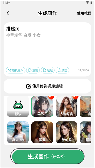 2、在【生成画作】页面,填写描述词,使用修饰词库编辑,选择画作风格、形状、图片效果;以上设置完成后,点击【一键生成】;